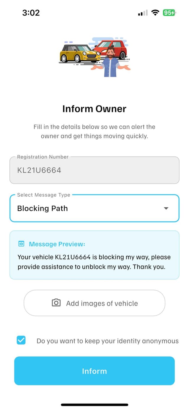 Send a quick message or photo alert directly to the car owner. Your privacy is protected, and the owner gets the info in real time.